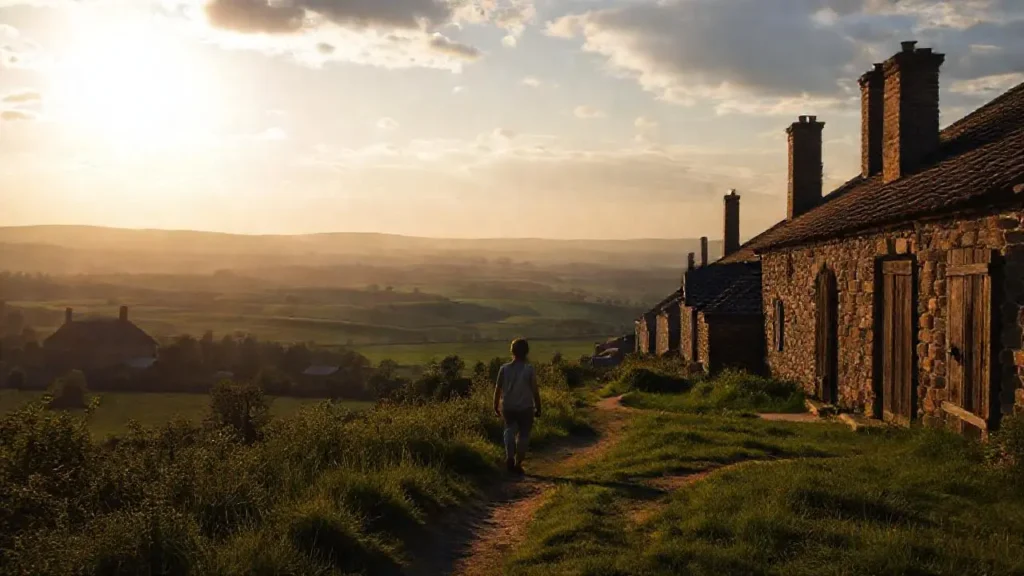 Paisaje rural, castillo antiguo, figura solitaria