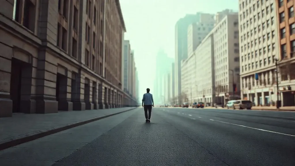 Campo ondulado, luz suave, figura distante