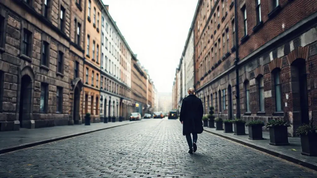 Calle europea tranquila, luz suave y difusa
