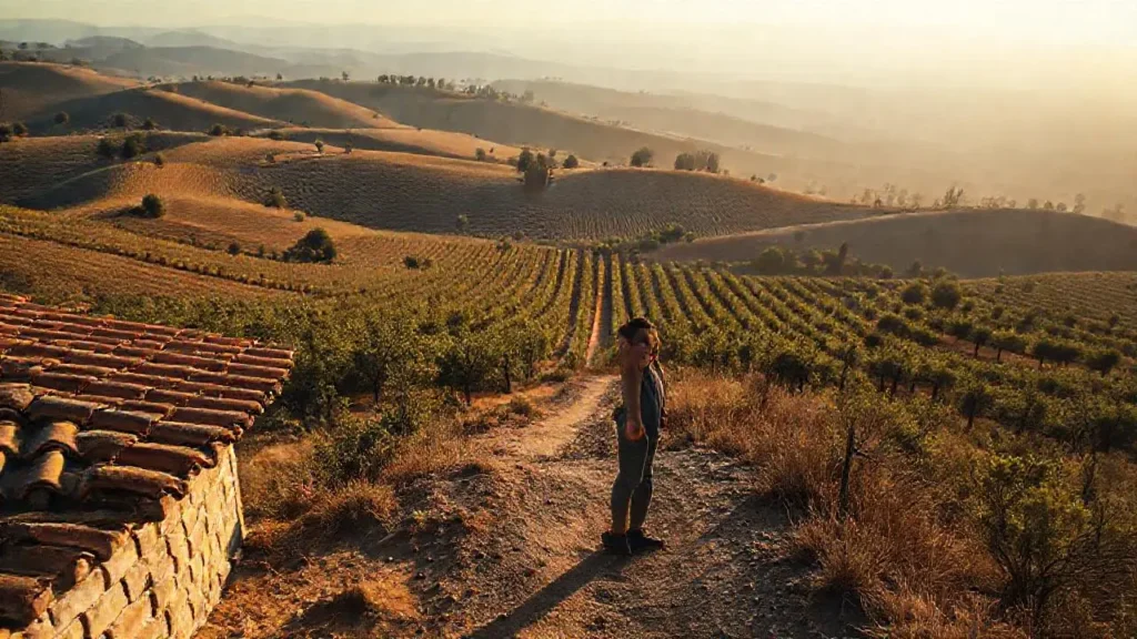 Amplio viñedo, calma y luz dorada